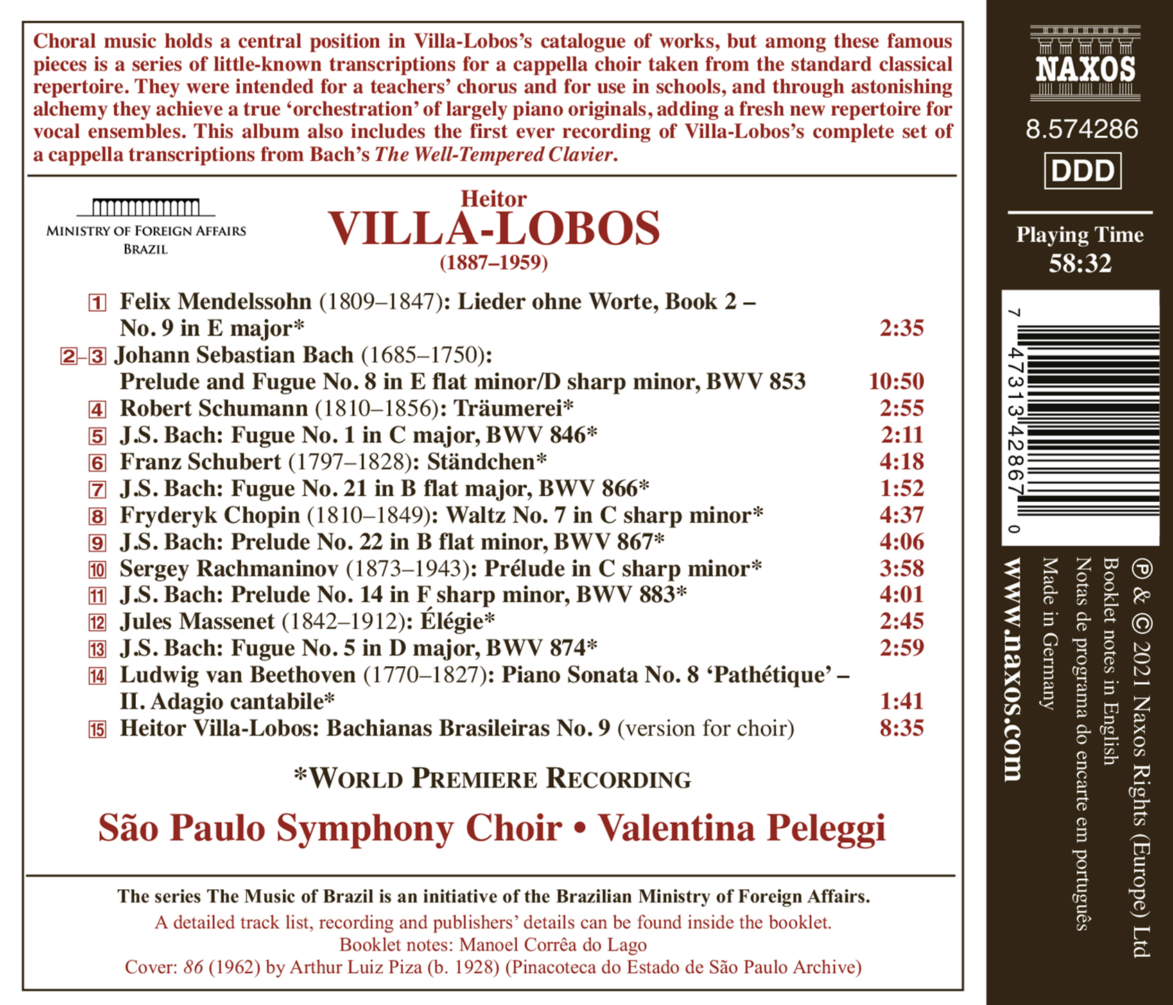 Essentially, Villa-Lobos takes instrumental works, often keyboard-based, from famous composers - Bach, Schumann, Mendelssohn, Schubert, Chopin, Rachmaninov, Massenet, and Beethoven, then arranges them for choir.