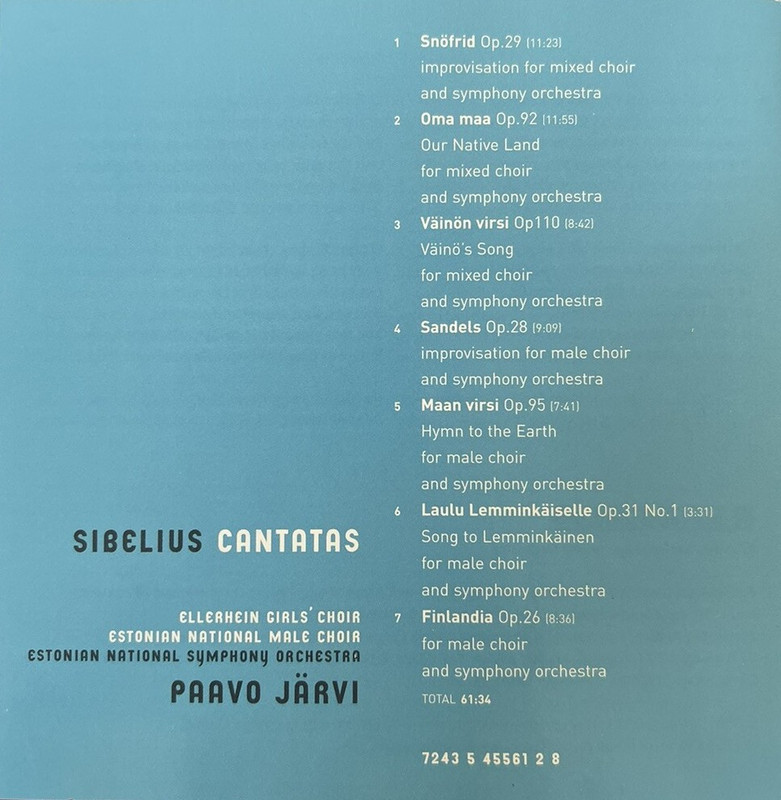 I really like the hearty sound of the Estonian National Symphony Orchestra, aided I am sure in no small part by Virgin Classics' engineering, one with a strong bass. The opening storm of Snöfrid really took me by surprise, particularly the wild clarinet solo in the opening orchestral portion, but as the recording went by, instrumental qualities were continually high. Paavo Järvi's Finlandia could maybe use some extra snarl, but I doubt that is the reason someone would or wouldn't visit this recording. Perhaps I am wrong...
