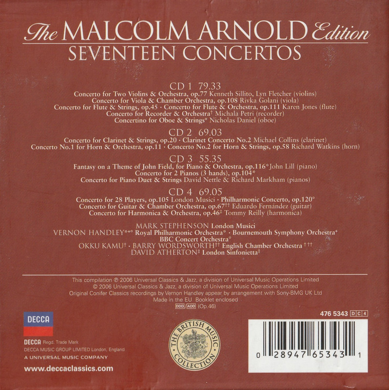 If there is something missing, it is the Oboe Concerto and the Trumpet Concerto. These are major works from Arnold's oeuvre, although Decca does include the little known Oboe Concertino. I suppose one could even lament the absence of the rare Gastronomic Concerto as well.