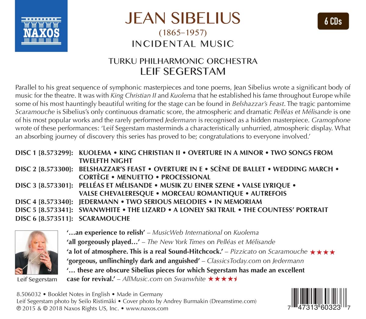 No matter what I think of the music, Leif Segerstam and the Turku Philharmonic Orchestra perform excellently throughout. The string sound Segerstam elicits from Turku is consistently gorgeous, and the Finnish conductor's patient way with the music of Sibelius assures the listener they receive the full breadth of the composer's music for the stage. To contrast Segerstam, most of these works have been previously recorded on BIS, most from Finnish conductor Osmo Vänskä, and are usually quite speedier or more flowing than this Naxos set. Of course, faster doesn't always translate to better, however, there are a few, such as Kuolema and Pelléas and Mélisande, which might have benefited a rougher or more contrasted handling.
