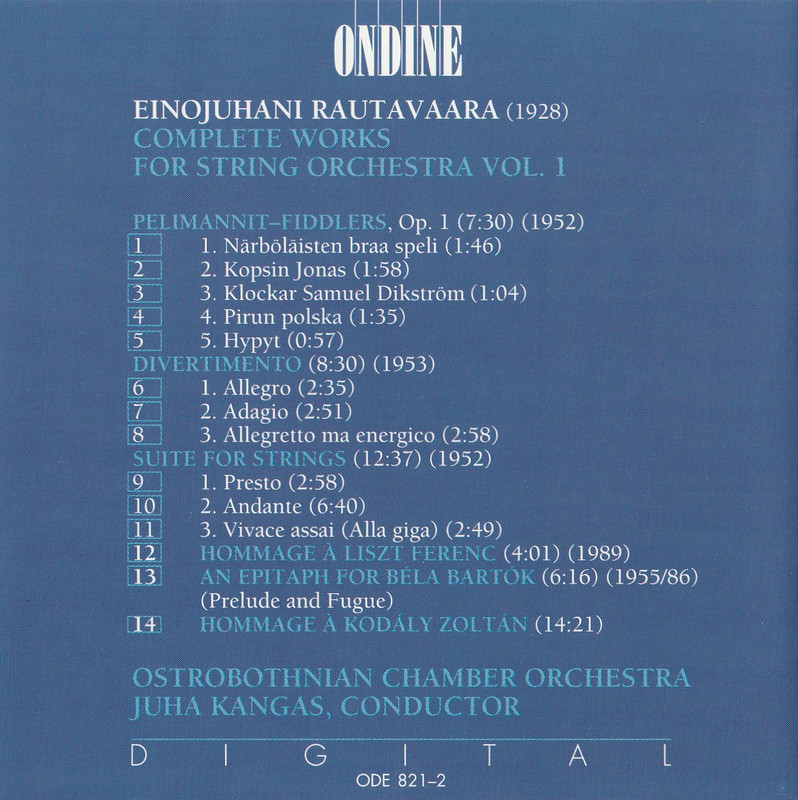 The Ostrobothnian Chamber Orchestra plays delightfully throughout, representing a region of Finland I was hitherto unfamiliar with (Truth be told, I thought these were space people who died in order to steal the plans of the Death Star for the Rebel Alliance!). Despite my uncertainty with some of Rautavaara's music here, I am greatly looking forward to hear what Ostrobothnian conductor Juha Kangas presents in Volume 2 of this short series of string orchestra music.